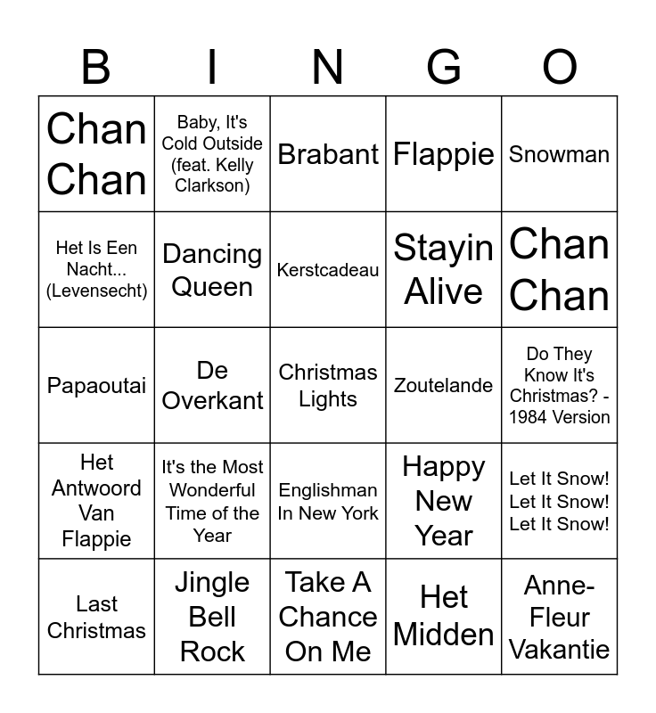 This bingo card has 66 words: Baby Come Back, Gloria In Excelsis Deo, Have Yourself A Merry Little Christmas, Let It Snow! Let It Snow! Let It Snow!, Goud, Kling Klokje Klingelingeling, Baby, It's Cold Outside (feat. Kelly Clarkson), Ik Heb Je Lief - Live, Kerstcadeau, Mistletoe, Englishman In New York, Sleigh Ride, Do They Know It's Christmas? - 1984 Version, Snowman, Viva La Vida, Het Is Een Nacht... (Levensecht), De Overkant, Chan Chan, Shallow, Stayin Alive, It's the Most Wonderful Time of the Year, Het Antwoord Van Flappie, Flappie, Murder On The Dancefloor, Gaan We Weg?, Perfect, Unwritten, The Christmas Song (Chestnuts Roasting on an Open Fire), Christmas Lights, Stille Nacht, Last Christmas, Feliz Navidad, September, How Deep Is Your Love, Happy New Year, Jingle Bell Rock, Best Time of the Year, Papaoutai, Het Midden, It's Beginning to Look a Lot like Christmas, Dancing Queen, Driving Home for Christmas, Zoutelande, Rockin' Around The Christmas Tree, We Are The World, Someone Like You, Chan Chan, De Herdertjes Lagen Bij Nachte, Anne-Fleur Vakantie, Huisfeestje, Terug In De Tijd, Christmas Wrapping, Thinking out Loud, Thank God It's Christmas, Het Regent Zonnestralen, Santa Tell Me, Ik Haat Hem Voor Jou, Being Alone At Christmas, Brabant, Take A Chance On Me, Het Antwoord Van Flappie, Santa Claus Is Coming To Town, Thriller, Damage, Piano Man and Kerst Met De Fam.