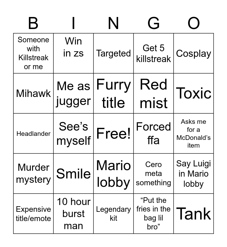 This bingo card has a free space and 24 words: Smile, 10 hour burst man, Furry title, Expensive title/emote, Cosplay, Someone with Killstreak or me, Mihawk, Win in zs, Forced ffa, Mario lobby, Red mist, Headlander, Cero meta something, Say Luigi in Mario lobby, Me as jugger, “Put the fries in the bag lil bro”, Asks me for a McDonald’s item, Targeted, Toxic, See’s myself, Tank, Murder mystery, Get 5 killstreak and Legendary kit.