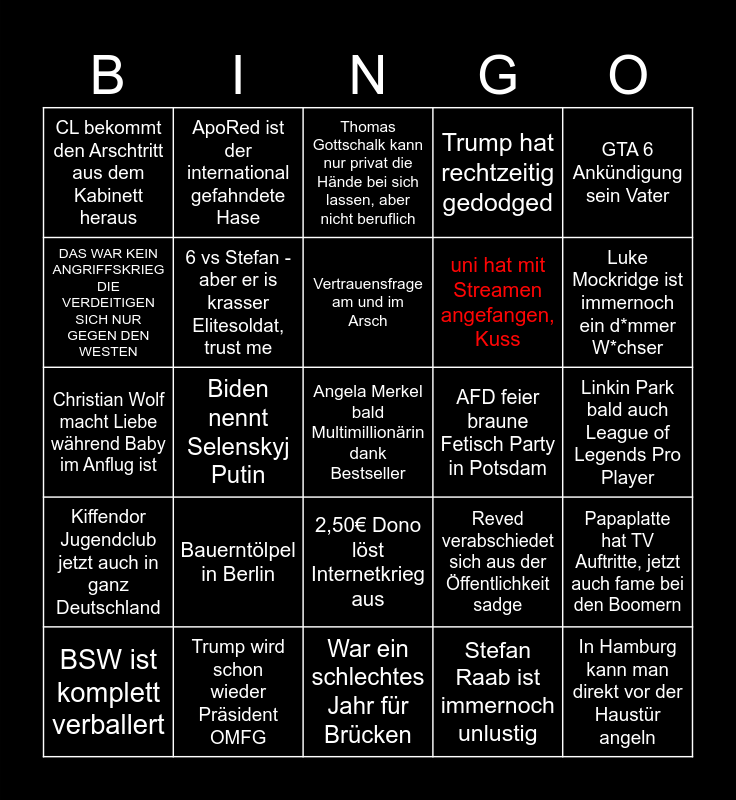This bingo card has a free space and 24 words: Bauerntölpel in Berlin, Trump wird schon wieder Präsident OMFG, Vertrauensfrage am und im Arsch, BSW ist komplett verballert, GTA 6 Ankündigung sein Vater, CL bekommt den Arschtritt aus dem Kabinett heraus, DAS WAR KEIN ANGRIFFSKRIEG DIE VERDEITIGEN SICH NUR GEGEN DEN WESTEN, ApoRed ist der international gefahndete Hase, AFD feier braune Fetisch Party in Potsdam, 2,50€ Dono löst Internetkrieg aus, uni hat mit Streamen angefangen, Kuss, Christian Wolf macht Liebe während Baby im Anflug ist, Reved verabschiedet sich aus der Öffentlichkeit sadge, Papaplatte hat TV Auftritte, jetzt auch fame bei den Boomern, 6 vs Stefan - aber er is krasser Elitesoldat, trust me, Stefan Raab ist immernoch unlustig, Linkin Park bald auch League of Legends Pro Player, Thomas Gottschalk kann nur privat die Hände bei sich lassen, aber nicht beruflich, Luke Mockridge ist immernoch ein d*mmer W*chser, Biden nennt Selenskyj Putin, In Hamburg kann man direkt vor der Haustür angeln, Kiffendor Jugendclub jetzt auch in ganz Deutschland, Trump hat rechtzeitig gedodged and War ein schlechtes Jahr für Brücken.