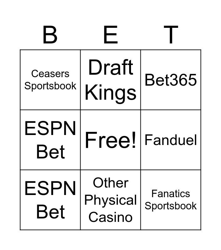 This bingo card has a free space and 8 words: Fanduel, Bet365, Draft Kings, ESPN Bet, Ceasers Sportsbook, Fanatics Sportsbook, ESPN Bet and Other Physical Casino.