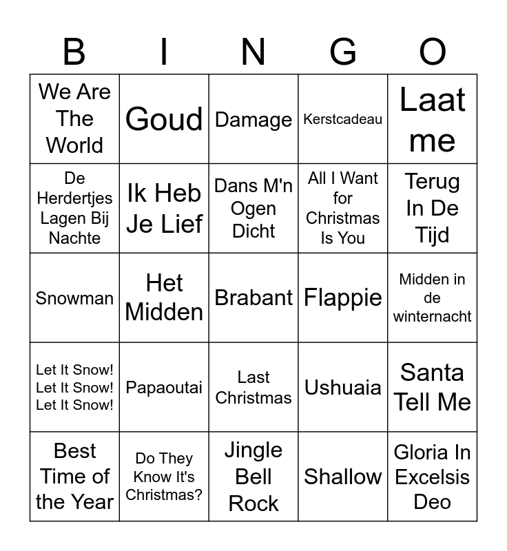 This bingo card has 70 words: Het Regent Zonnestralen, Midden in de winternacht, Anne-Fleur Vakantie, Stille Nacht, Do They Know It's Christmas?, Baby Come Back, Kerstcadeau, Go Your Own Way, Laat me, I would stay, Santa Tell Me, Baby, It's Cold Outside, We Are The World, Damage, KERST MET DE FAM, Het Midden, Last Christmas, All I Want for Christmas Is You, Feliz Navidad, Let It Snow! Let It Snow! Let It Snow!, Flappie, Ushuaia, Terug In De Tijd, Ik Haat Hem Voor Jou, Zoutelande, Perfect, Thinking out Loud, Someone Like You, Shallow, Gaan We Weg?, Goud, De Overkant, Kling Klokje Klingelingeling, Huisfeestje, It's Beginning to Look a Lot like Christmas, Englishman In New York, Murder On The Dancefloor, Chan Chan, Viva La Vida, De Herdertjes Lagen Bij Nachte, Gloria In Excelsis Deo, Papaoutai, Brabant, Het Is Een Nacht... (Levensecht), Underneath the Tree, Ik Heb Je Lief, Best Time of the Year, Christmas Lights, Killing Me Softly With His Song, Dancing Queen, Take A Chance On Me, Driving Home for Christmas, Thriller, Thank God It's Christmas, Jingle Bell Rock, Unwritten, Dans M'n Ogen Dicht, Rockin' Around The Christmas Tree, How Deep Is Your Love, It's the Most Wonderful Time of the Year, Snowman, Being Alone At Christmas, Santa Claus Is Coming To Town, Mistletoe, Piano Man, Stayin Alive, September, Have Yourself A Merry Little Christmas, Happy New Year and Sleigh Ride.