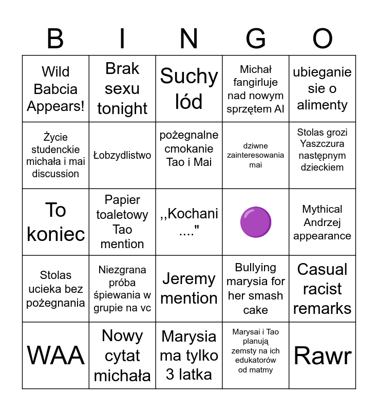This bingo card has a free space and 24 words: Niezgrana próba śpiewania w grupie na vc, Nowy cytat michała, pożegnalne cmokanie Tao i Mai, WAA, ubieganie sie o alimenty, Wild Babcia Appears!, Życie studenckie michała i mai discussion, Brak sexu tonight, 🟣, Jeremy mention, dziwne zainteresowania mai, To koniec, Bullying marysia for her smash cake, Casual racist remarks, Łobzydlistwo, Marysai i Tao planują zemsty na ich edukatorów od matmy, Mythical Andrzej appearance, Suchy lód, Stolas grozi Yaszczura następnym dzieckiem, Papier toaletowy Tao mention, Rawr, Stolas ucieka bez pożegnania, Michał fangirluje nad nowym sprzętem AI and Marysia ma tylko 3 latka.