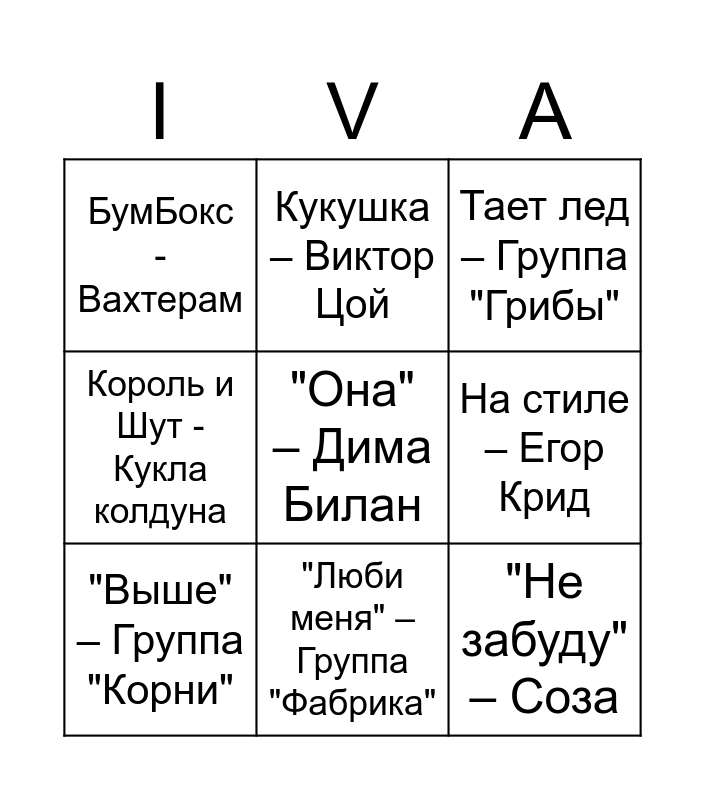 This bingo card has a free space and 11 words: Free!, "Люби меня" – Группа "Фабрика", "Не забуду" – Соза, "Выше" – Группа "Корни", Кукушка – Виктор Цой, Тает лед – Группа "Грибы", На стиле – Егор Крид, Пьяное солнце – Слава, Король и Шут - Кукла колдуна, БумБокс - Вахтерам and Ленинград - Экспонат.