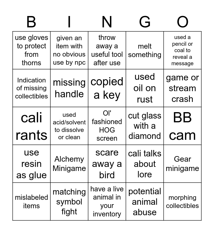 This bingo card has a free space and 38 words: spent more than 5 minutes on a minigame, sharpened a tool before using it, bad voice acting, missing handle, Gear minigame, Alchemy Minigame, copied a key, reached an item with a long object, used a pencil or coal to reveal a message, used oil on rust, used acid/solvent to dissolve or clean, melt something, morphing collectibles, BB cam, Indication of missing collectibles, use resin as glue, use a duster on cobwebs, throw away a useful tool after use, bonus content, cut glass with a diamond, use gloves to protect from thorns, matching symbol fight, game or stream crash, mislabeled items, use a coin instead of a screwdriver, have a live animal in your inventory, use a sharp object to obtain another sharp object, use a paperclip on a broken zipper, combine a string with a hook or magnet, music that reminds Gab of a non-HOG, solve a puzzle by accident or brute force, scare away a bird, potential animal abuse, given an item with no obvious use by npc, Tato harasses mother, cali talks about lore, cali rants and FREE SPACE MERRY CHRISTMAS.