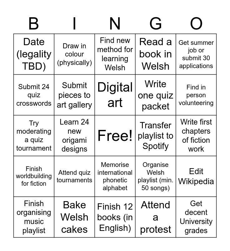 This bingo card has a free space and 24 words: Attend quiz tournaments, Bake Welsh cakes, Digital art, Finish organising music playlist, Get summer job or submit 30 applications, Date (legality TBD), Submit 24 quiz crosswords, Draw in colour (physically), Transfer playlist to Spotify, Memorise international phonetic alphabet, Write one quiz packet, Try moderating a quiz tournament, Organise Welsh playlist (min. 50 songs), Edit Wikipedia, Submit pieces to art gallery, Attend a protest, Write first chapters of fiction work, Find new method for learning Welsh, Find in person volunteering, Learn 24 new origami designs, Get decent University grades, Finish worldbuilding for fiction, Read a book in Welsh and Finish 12 books (in English).