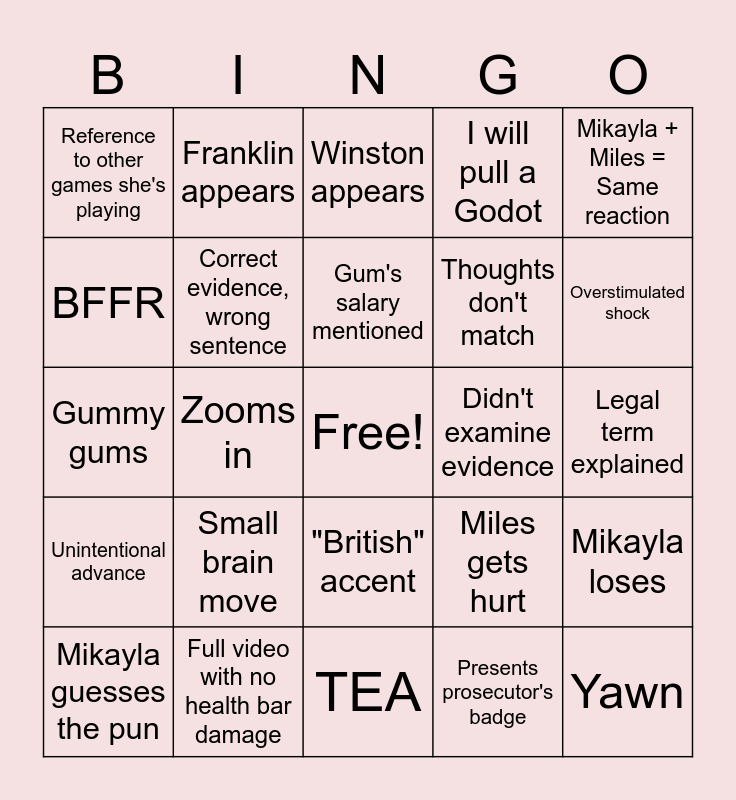 This bingo card has a free space and 27 words: Miles gets hurt, Old character jumpscare, Thoughts don't match, TEA, BFFR, Winston appears, Franklin appears, Unintentional advance, Didn't examine evidence, Mikayla loses, Gummy gums, I will pull a Godot, Mikayla guesses the pun, Full video with no health bar damage, Overstimulated shock, Mikayla misses the obvious, Correct evidence, wrong sentence, Gum's salary mentioned, Small brain move, Reference to other games she's playing, Legal term explained, Presents prosecutor's badge, Zooms in, Yawn, "British" accent, Mikayla + Miles = Same reaction and Correctly guesses the culpit.