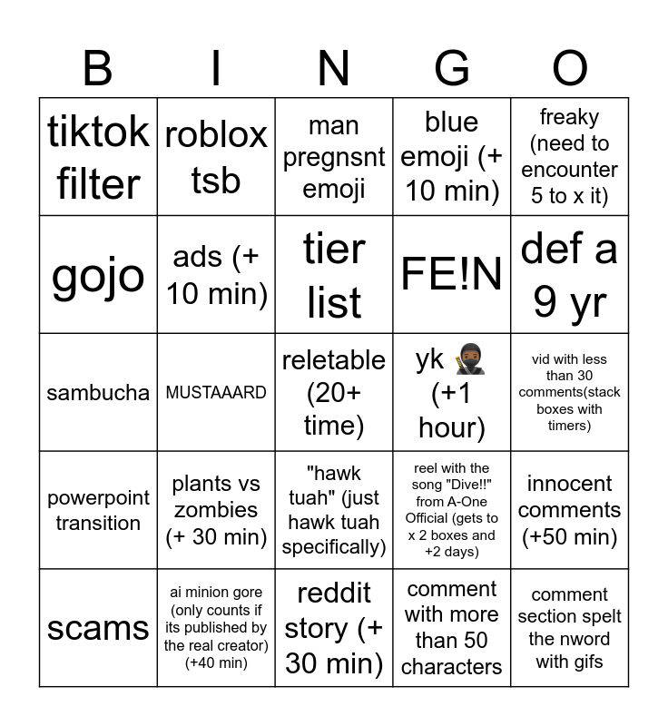 This bingo card has a free space and 24 words: plants vs zombies (+ 30 min), ai minion gore (only counts if its published by the real creator) (+40 min), tier list, scams, freaky (need to encounter 5 to x it), tiktok filter, gojo, roblox tsb, yk 🥷🏾(+1 hour), "hawk tuah" (just hawk tuah specifically), FE!N, sambucha, reel with the song "Dive!!" from A-One Official (gets to x 2 boxes and +2 days), innocent comments (+50 min), ads (+ 10 min), comment with more than 50 characters, vid with less than 30 comments(stack boxes with timers), man pregnsnt emoji, def a 9 yr, MUSTAAARD, comment section spelt the nword with gifs, powerpoint transition, blue emoji (+ 10 min) and reddit story (+ 30 min).