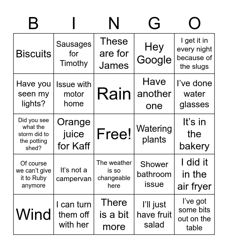This bingo card has a free space and 28 words: I did it in the air fryer, Reference to Max dying in Canada, Have another one, I’ll just have fruit salad, Have you seen my lights?, These are for James, Sausages for Timothy, Of course we can’t give it to Ruby anymore, Watering plants, Wind, Did you see what the storm did to the potting shed?, Hey Google, I can turn them off with her, There is a bit more, I’ve done water glasses, Chocolate mousse, It’s not a campervan, Issue with motor home, Rain, The weather is so changeable here, Biscuits, I’m going for my bath, I’ve got some bits out on the table, Orange juice for Kaff, It’s in the bakery, Shower bathroom issue, I get it in every night because of the slugs and Get out woman.