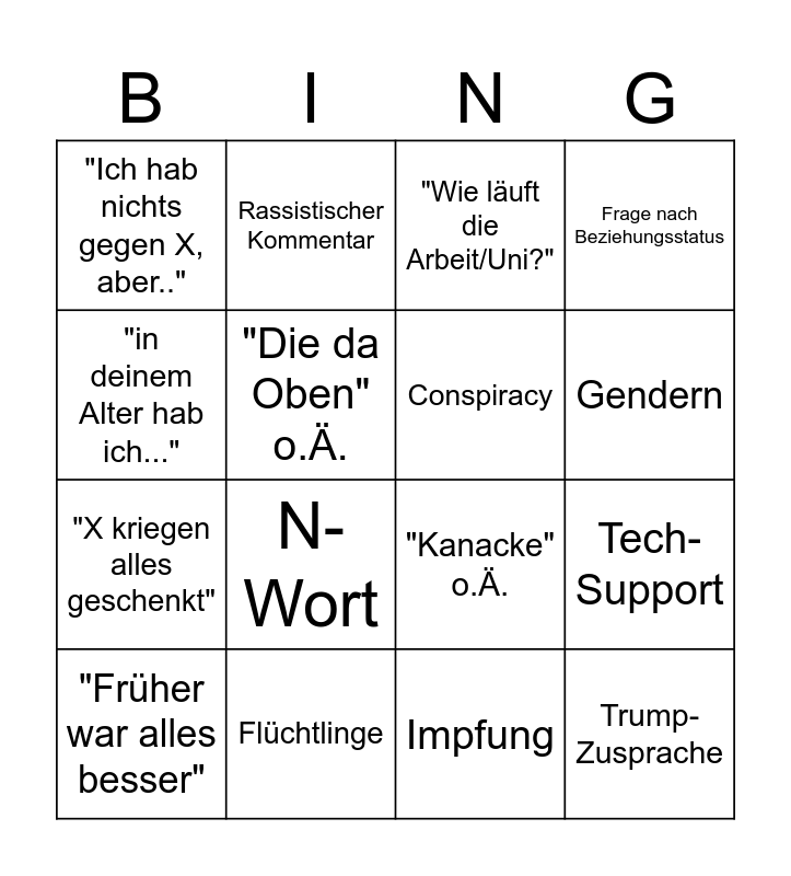 This bingo card has 16 words: Flüchtlinge, Tech-Support, "Wie läuft die Arbeit/Uni?", "Ich hab nichts gegen X, aber..", "X kriegen alles geschenkt", Rassistischer Kommentar, "Kanacke" o.Ä., Impfung, "in deinem Alter hab ich...", "Die da Oben" o.Ä., "Früher war alles besser", Frage nach Beziehungsstatus, N-Wort, Gendern, Conspiracy and Trump-Zusprache.