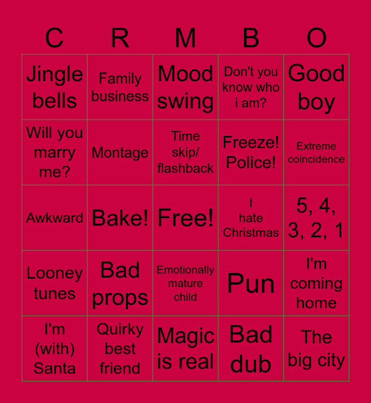 This bingo card has a free space and 29 words: I'm (with) Santa, Childhood Friend, Bake!, Divorce, Jingle bells, Mood swing, Montage, Bad props, I hate Christmas, Quirky best friend, 5, 4, 3, 2, 1, The big city, Magic is real, Bad dub, Extreme coincidence, Choc hotolate, Emotionally mature child, Looney tunes, Good boy, Awkward, Pun, Television, Freeze! Police!, Will you marry me?, Don't you know who i am?, Family business, I'm coming home, Time skip/ flashback and Contest.