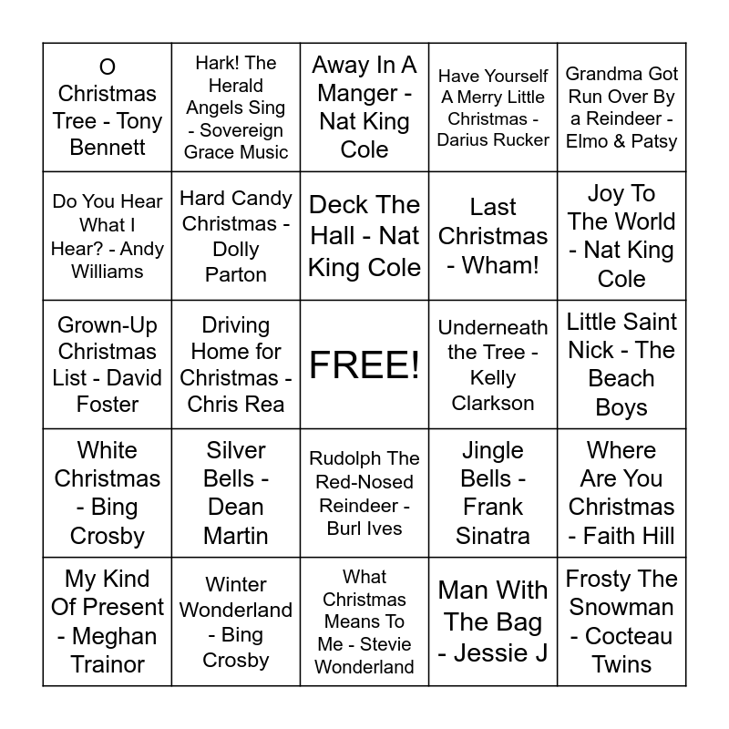 This bingo card has a free space and 75 words: All I Want for Christmas Is You - Mariah Carey, All The Gifts I Need - JD McPherson, Away In A Manger - Nat King Cole, Baby, It's Cold Outside - Dean Martin, Christmas (Baby Please Come Home) - Mariah Carey, Christmas Song (Chestnuts Roasting On An Open Fire) - Carpenters, Christmas Time Is Here - Vince Guaraldi Trio, Christmas Tree Farm - Taylor Swift, The Christmas Waltz - She & Him, Christmas Wrapping - The Waitresses, Cool Yule - Louis Armstrong, Cozy Little Christmas - Katy Perry, Deck The Hall - Nat King Cole, Do You Hear What I Hear? - Andy Williams, Do You Want to Build a Snowman? - Kristen Bell, Driving Home for Christmas - Chris Rea, The First Noel - Andy Williams, Frosty The Snowman - Cocteau Twins, God Rest Ye Merry Gentlemen - Michael McDonald, Grandma Got Run Over By a Reindeer - Elmo & Patsy, Green Christmas - Barenaked Ladies, Grown-Up Christmas List - David Foster, Hard Candy Christmas - Dolly Parton, Hark! The Herald Angels Sing - Sovereign Grace Music, Have Yourself A Merry Little Christmas - Darius Rucker, Here Comes Santa Claus - Gene Autry, Holly Jolly Christmas - Michael Buble, I Saw Mommy Kissing Santa Claus - The Jackson 5, It Came Upon A Midnight Clear - Carpenters, It's Beginning to Look a Lot Like Christmas - Michael Buble, I've Got My Love To Keep Me Warm - Ella Fitzgerald, Jingle Bell Drunk - RaeLynn, Jingle Bell Rock - Bobby Helms, Jingle Bells - Frank Sinatra, Joy To The World - Nat King Cole, Last Christmas - Wham!, Let It Snow, Let It Snow, Let It Snow - Darius Rucker, The Little Drummer Boy - Bing Crosby, Little Saint Nick - The Beach Boys, Man With The Bag - Jessie J, A Marshmallow World - Dean Martin, Mary, Did You Know? - Pentatonix, Merry Christmas Darling - Carpenters, Merry Christmas, Happy Holidays - *NSYNC, Mistletoe - Colbie Caillat, Mistletoe And Holly - Frank Sinatra, My Kind Of Present - Meghan Trainor, O Christmas Tree - Tony Bennett, O Come All Ye Faithful - Nat King Cole, O Little Town Of Bethlehem - Dolly Parton, Rockin' Around The Christmas Tree - Brenda Lee, Rudolph The Red-Nosed Reindeer - Burl Ives, Run Rudolph Run - Chuck Berry, Santa Baby - Eartha Kitt, Santa, Can't You Hear Me - Kelly Clarkson/Ariana Grande, Santa Claus Is Comin' to Town - Frank Sinatra, Santa Claus Is Watching You - Ray Stevens, Santa Tell Me - Ariana Grande, Shake Up Christmas - Train, Silent Night - Teddy Swims, Silver Bells - Dean Martin, Sleigh Ride - Harry Connick, Jr., Step Into Christmas - Elton John, (There's No Place Like) Home for the Holidays - Perry Como, This Christmas - Donny Hathaway, Underneath the Tree - Kelly Clarkson, Up On The House Top (Ho Ho Ho) - Gene Autry, Wake Up, Wake Up - Matt Wertz, We Wish You a Merry Christmas - Pentatonix, Where Are You Christmas - Faith Hill, White Christmas - Bing Crosby, Winter Wonderland - Bing Crosby, You For Christmas - Kelly Clarkson, What Christmas Means To Me - Stevie Wonderland and Wrapped in Red - Kelly Clarkson.