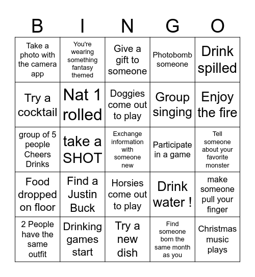 This bingo card has a free space and 39 words: Someone talks about dnd, Someone talks about Magic the gathering, Nat 20 rolled, Nat 1 rolled, 2 People have the same outfit, Horsies come out to play, Doggies come out to play, Shotgun a beer, Drink spilled, Food dropped on floor, take a SHOT, Photobomb someone, Christmas music plays, Tell someone about your favorite monster, Participate in a game, Find a Justin Buck, Use the bathroom, Take a photo with the camera app, Mr. Brightside starts playing, Drink water !, Try a cocktail, Try a new dish, Group singing, Enjoy the fire, Make a bad pun, Clean up after yourself, Do a funny dance, Find a shared hobby with someone new, you're wearing something Christmas themed, You're wearing something fantasy themed, Fart loudly, Burp loudly, Give a gift to someone, Drinking games start, Find someone born the same month as you, take a selfie, make someone pull your finger, group of 5 people Cheers Drinks and Get someone to high 5 you.