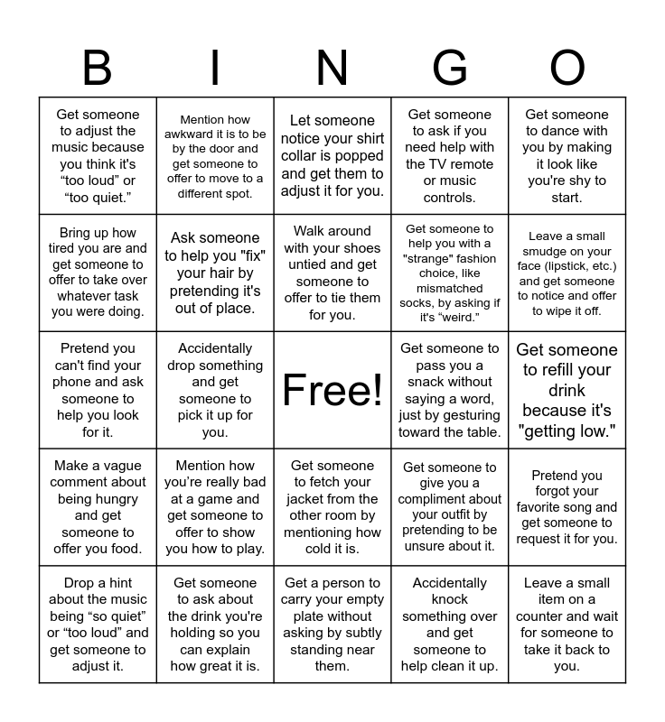 This bingo card has a free space and 30 words: Get someone to ask about the drink you're holding so you can explain how great it is., Subtly get a person to bring you a drink by pretending to be thirsty but not asking for it., Accidentally drop something and get someone to pick it up for you., Leave a book or item in a place where someone will pick it up for you., Get someone to adjust the music because you think it's “too loud” or “too quiet.”, Let someone notice your shirt collar is popped and get them to adjust it for you., Ask someone to help you "fix" your hair by pretending it's out of place., Get someone to fetch your jacket from the other room by mentioning how cold it is., Get someone to pass you a snack without saying a word, just by gesturing toward the table., Get a person to carry your empty plate without asking by subtly standing near them., Get someone to refill your drink because it's "getting low.", Leave a small item on a counter and wait for someone to take it back to you., Accidentally knock something over and get someone to help clean it up., Get someone to hand you a piece of food by giving them a look like you're waiting., Leave a small smudge on your face (lipstick, etc.) and get someone to notice and offer to wipe it off., Pretend to struggle with opening a bottle and wait for someone to offer help., Get someone to give you a compliment about your outfit by pretending to be unsure about it., Make a vague comment about being hungry and get someone to offer you food., Mention how you’re really bad at a game and get someone to offer to show you how to play., Get someone to dance with you by making it look like you're shy to start., Pretend you can't find your phone and ask someone to help you look for it., Put something on a high shelf and get someone to ask if they should get it down for you., Mention how awkward it is to be by the door and get someone to offer to move to a different spot., Get someone to help you with a "strange" fashion choice, like mismatched socks, by asking if it's “weird.”, Bring up how tired you are and get someone to offer to take over whatever task you were doing., Get someone to ask if you need help with the TV remote or music controls., Pretend you forgot your favorite song and get someone to request it for you., Drop a hint about the music being “so quiet” or “too loud” and get someone to adjust it., Walk around with your shoes untied and get someone to offer to tie them for you. and Subtly knock over a drink and get someone to grab you a new one without you asking directly..