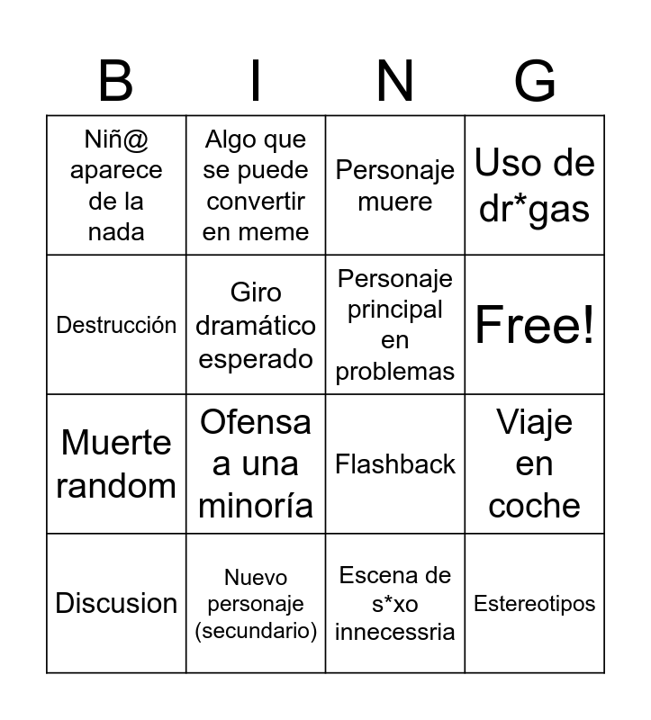 This bingo card has 17 words: Escena de s*xo innecessria, Discusion, Personaje muere, Niñ@ aparece de la nada, Ofensa a una minoría, Uso de dr*gas, Viaje en coche, Personaje principal en problemas, Free!, Giro dramático esperado, Nuevo personaje (secundario), Flashback, Destrucción, Algo que se puede convertir en meme, Muerte random, Personalidades distintas and Estereotipos.