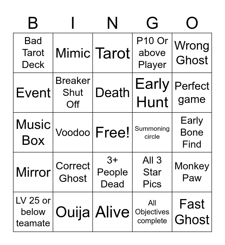 This bingo card has a free space and 24 words: Correct Ghost, Ouija, Death, LV 25 or below teamate, Wrong Ghost, Bad Tarot Deck, Event, Mimic, Summoning circle, 3+ People Dead, Early Hunt, Music Box, All 3 Star Pics, Monkey Paw, Breaker Shut Off, All Objectives complete, Early Bone Find, Tarot, Perfect game, Voodoo, Fast Ghost, Mirror, P10 Or above Player and Alive.