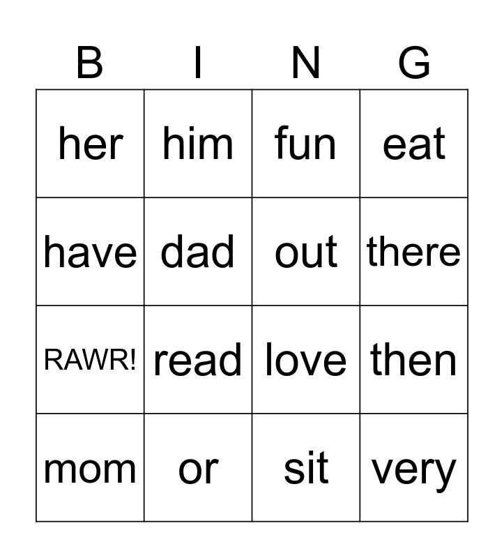 This bingo card has 25 words: said, yes, love, did, her, him, fun, eat, RAWR!, read, sit, then, saw, or, out, how, mom, dad, your, very, have, into, could, there and BOO!.