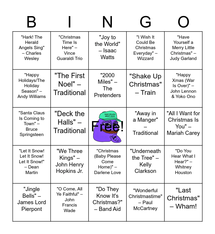 This bingo card has a free space and 29 words: "Jingle Bells" – James Lord Pierpont, "Silent Night" – Franz Gruber, "Deck the Halls" – Traditional, "O Holy Night" – Adolphe Adam, "Hark! The Herald Angels Sing" – Charles Wesley, "Joy to the World" – Isaac Watts, "The First Noel" – Traditional, "We Three Kings" – John Henry Hopkins Jr., "Away in a Manger" – Traditional, "O Come, All Ye Faithful" – John Francis Wade, "All I Want for Christmas Is You" – Mariah Carey, "Last Christmas" – Wham!, "Do They Know It's Christmas?" – Band Aid, "Wonderful Christmastime" – Paul McCartney, "Happy Xmas (War Is Over)" – John Lennon & Yoko Ono, "Feliz Navidad" – José Feliciano, "Christmas (Baby Please Come Home)" – Darlene Love, "Let It Snow! Let It Snow! Let It Snow!" – Dean Martin, "Have Yourself a Merry Little Christmas" – Judy Garland, "Santa Claus Is Coming to Town" – Bruce Springsteen, "Underneath the Tree" – Kelly Clarkson, "Mistletoe" – Justin Bieber, "Shake Up Christmas" – Train, "Happy Holidays/The Holiday Season" – Andy Williams, "I Wish It Could Be Christmas Everyday" – Wizzard, "Christmas Time Is Here" – Vince Guaraldi Trio, "Do You Hear What I Hear?" – Whitney Houston, "2000 Miles" – The Pretenders and "Christmas Lights" – Coldplay.