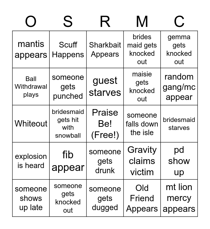 This bingo card has a free space and 38 words: Bride gets hit with snowball, animal attack, animal howls, someone gets punched, pd show up, fib appear, guest starves, SNOWBALL FIGHT, gemma gets knocked out, maisie gets knocked out, bridesmaid gets hit with snowball, brides maid gets knocked out, mt lion mercy appears, bridesmaid starves, Ball Withdrawal plays, explosion is heard, blocks appear, Sharkbait Appears, SB appear, someone falls down the isle, mantis appears, someone gets knocked out, random gang/mc appear, someone shows up late, Aspen appears, someone gets dugged, Drugs!, someone corners, Someone gets sloaned, Someone gets Maisie'd, random tow truck stuff, someone gets drunk, Old Friend Appears, Scuff Happens, Someone gets shot, Gravity claims victim, Whiteout and someone gets arrested.