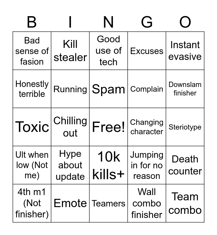 This bingo card has a free space and 24 words: Hype about update, Emote, Spam, 4th m1 (Not finisher), Instant evasive, Bad sense of fasion, Honestly terrible, Kill stealer, Changing character, 10k kills+, Complain, Toxic, Jumping in for no reason, Death counter, Running, Wall combo finisher, Steriotype, Good use of tech, Downslam finisher, Chilling out, Team combo, Ult when low (Not me), Excuses and Teamers.