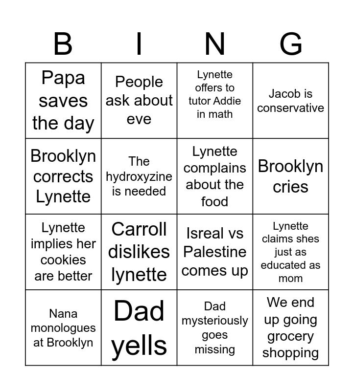 This bingo card has 16 words: Dad yells, Lynette claims shes just as educated as mom, Lynette offers to tutor Addie in math, Papa saves the day, Lynette implies her cookies are better, People ask about eve, Isreal vs Palestine comes up, Dad mysteriously goes missing, Brooklyn corrects Lynette, The hydroxyzine is needed, Nana monologues at Brooklyn, Jacob is conservative, Carroll dislikes lynette, Brooklyn cries, Lynette complains about the food and We end up going grocery shopping.