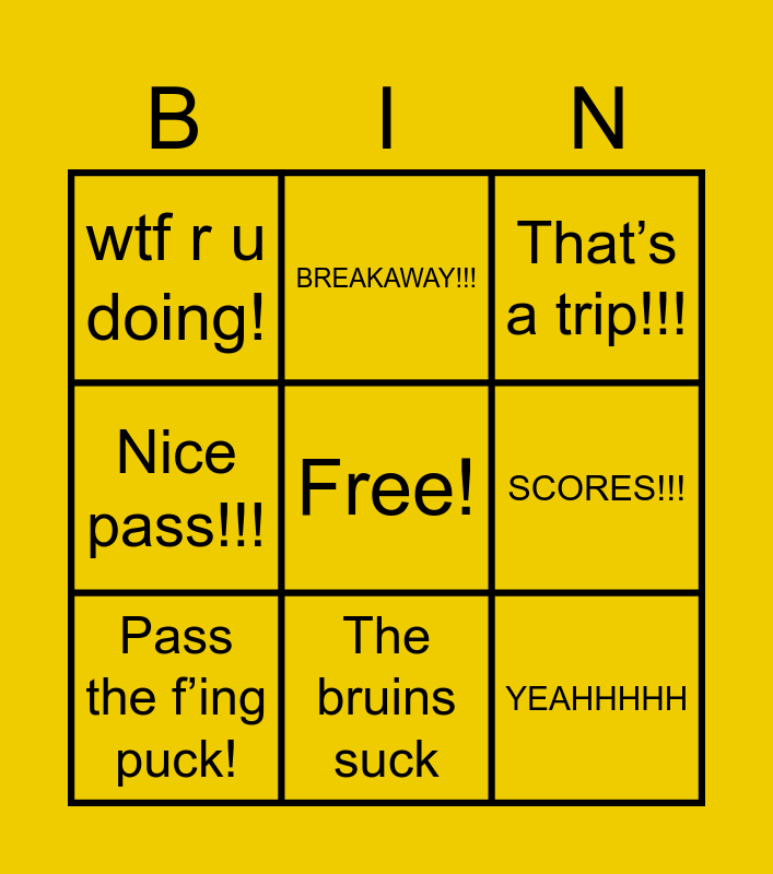This bingo card has a free space and 8 words: SCORES!!!, That’s a trip!!!, BREAKAWAY!!!, Pass the f’ing puck!, wtf r u doing!, YEAHHHHH, Nice pass!!! and The bruins suck.