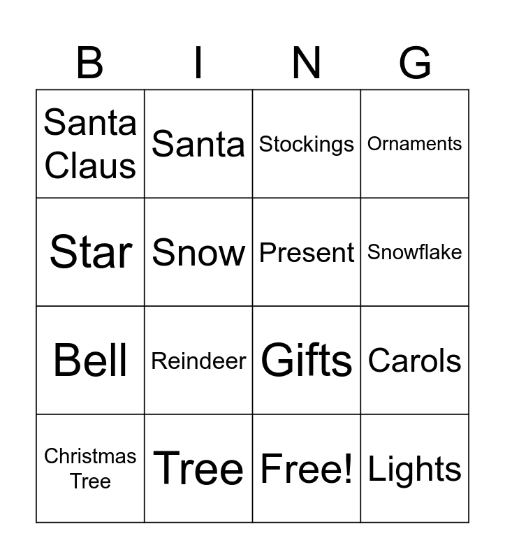 This bingo card has 17 words: Free!, Christmas Tree, Stockings, Santa Claus, Reindeer, Ornaments, Carols, Present, Snowflake, Snow, Tree, Gifts, Star, Santa, Bell, Socks and Lights.