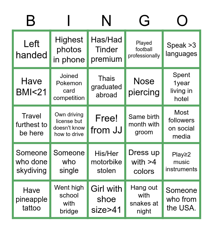 This bingo card has a free space and 24 words: Someone who single, Went high school with bridge, Thais graduated abroad, Have pineapple tattoo, Speak >3 languages, Left handed, Have BMI<21, Highest photos in phone, Same birth month with groom, His/Her motorbike stolen, Nose piercing, Travel furthest to be here, Dress up with >4 colors, Play≥2 music instruments, Joined Pokemon card competition, Hang out with snakes at night, Most followers on social media, Has/Had Tinder premium, Spent 1year living in hotel, Own driving license but doesn't know how to drive, Someone who from the USA., Someone who done skydiving, Played football professionally and Girl with shoe size>41.