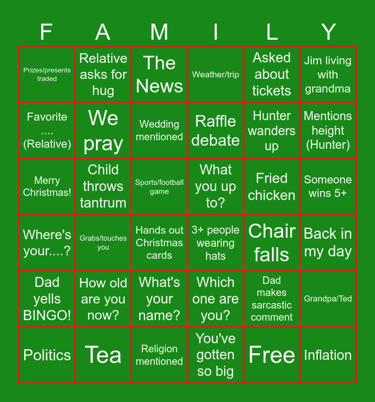 This bingo card has 36 words: Which one are you?, What's your name?, You've gotten so big, Favorite ....(Relative), Where's your....?, What you up to?, We pray, Religion mentioned, Asked about tickets, Dad makes sarcastic comment, Mentions height (Hunter), Weather/trip, Grandpa/Ted, Child throws tantrum, Raffle debate, Prizes/presents traded, Dad yells BINGO!, Fried chicken, Merry Christmas!, The News, Sports/football game, Grabs/touches you, 3+ people wearing hats, Hands out Christmas cards, Chair falls, Relative asks for hug, Hunter wanders up, Tea, Wedding mentioned, Jim living with grandma, Inflation, Politics, Back in my day, Someone wins 5+, How old are you now? and Free.