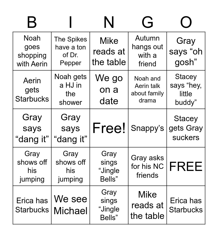 This bingo card has a free space and 49 words: Stacey says “hey, little buddy”, Erica has Starbucks, Noah and Nathan talk about video games, Gray sings “Jingle Bells”, Gray shows off his jumping, Gran says “Grayson”, The Spikes have a ton of Dr. Pepper, Gray pets Vancouver, Aerin gets Starbucks, We see Michael, Noah gets a HJ in the shower, Autumn hangs out with a friend, FREE, Gray asks for his NC friends, Stacey gets Gray suckers, Papa and Gigi have apple sauce, We go on a date, Snappy’s, Gray makes everyone pray, Gray says “oh gosh”, Gray says “dang it”, Mike reads at the table, Noah goes shopping with Aerin, Noah and Aerin talk about family drama, Noah and Aimee talk about video games, Stacey says “hey, little buddy”, Erica has Starbucks, Noah and Nathan talk about video games, Gray sings “Jingle Bells”, Gray shows off his jumping, Gran says “Grayson”, The Spikes have a ton of Dr. Pepper, Gray pets Vancouver, Aerin gets Starbucks, We see Michael, Noah gets a HJ in the shower, Autumn hangs out with a friend, Gray asks for his NC friends, Stacey gets Gray suckers, Papa and Gigi have apple sauce, We go on a date, Snappy’s, Gray makes everyone pray, Gray says “oh gosh”, Gray says “dang it”, Mike reads at the table, Noah goes shopping with Aerin, Noah and Aerin talk about family drama and Noah and Aimee talk about video games.