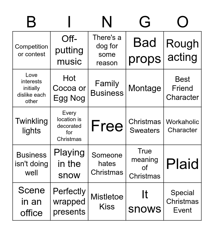 This bingo card has a free space and 34 words: Dead parent, It snows, "Christmas Miracle", Baking scene, Business isn't doing well, Hot Cocoa or Egg Nog, Rough acting, Scene in an office, Off-putting music, Awkward silence, Family Business, There's a dog for some reason, Small town/ home town, Red Coat, Christmas Sweaters, Best Friend Character, Perfectly wrapped presents, Twinkling lights, Playing in the snow, True meaning of Christmas, Someone hates Christmas, Massive house, Competition or contest, Workaholic Character, Mistletoe Kiss, Special Christmas Event, Bad props, Someone is scheming, Montage, Love interests initially dislike each other, It's clearly not cold outside, Every location is decorated for Christmas, Plaid and This is just in a house.