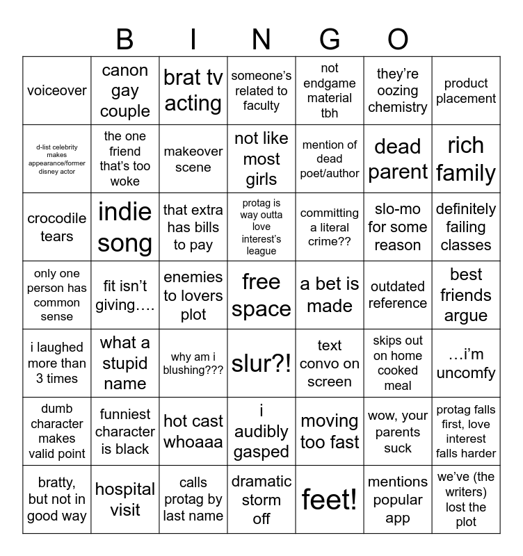 This bingo card has a free space and 48 words: moving too fast, dead parent, dramatic storm off, fit isn’t giving…., that extra has bills to pay, best friends argue, canon gay couple, hospital visit, they’re oozing chemistry, slur?!, product placement, someone’s related to faculty, slo-mo for some reason, committing a literal crime??, dumb character makes valid point, outdated reference, d-list celebrity makes appearance/former disney actor, rich family, wow, your parents suck, not endgame material tbh, mention of dead poet/author, enemies to lovers plot, voiceover, the one friend that’s too woke, protag falls first, love interest falls harder, makeover scene, definitely failing classes, bratty, but not in good way, protag is way outta love interest’s league, indie song, mentions popular app, a bet is made, …i’m uncomfy, funniest character is black, only one person has common sense, text convo on screen, skips out on home cooked meal, crocodile tears, why am i blushing???, hot cast whoaaa, i laughed more than 3 times, we’ve (the writers) lost the plot, brat tv acting, calls protag by last name, not like most girls, i audibly gasped, what a stupid name and feet!.