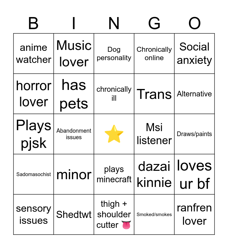 This bingo card has a free space and 24 words: minor, Shedtwt, chronically ill, sensory issues, Social anxiety, anime watcher, horror lover, Music lover, Msi listener, plays minecraft, Trans, Plays pjsk, dazai kinnie, loves ur bf, has pets, Smoked/smokes, Draws/paints, Dog personality, Alternative, Abandonment issues, ranfren lover, Sadomasochist, Chronically online and thigh + shoulder cutter 👅.