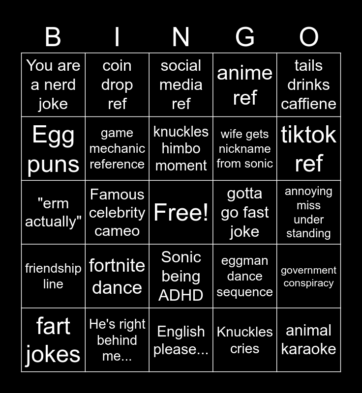 This bingo card has a free space and 24 words: fortnite dance, He's right behind me..., knuckles himbo moment, fart jokes, tails drinks caffiene, You are a nerd joke, Egg puns, coin drop ref, gotta go fast joke, Sonic being ADHD, wife gets nickname from sonic, "erm actually", eggman dance sequence, government conspiracy, game mechanic reference, Knuckles cries, annoying miss under standing, social media ref, tiktok ref, Famous celebrity cameo, animal karaoke, friendship line, anime ref and English please....