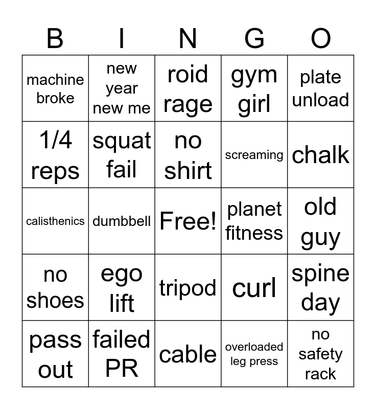 This bingo card has a free space and 24 words: ego lift, failed PR, no shirt, pass out, plate unload, machine broke, 1/4 reps, new year new me, planet fitness, tripod, screaming, calisthenics, curl, spine day, squat fail, overloaded leg press, old guy, roid rage, chalk, dumbbell, no safety rack, no shoes, gym girl and cable.