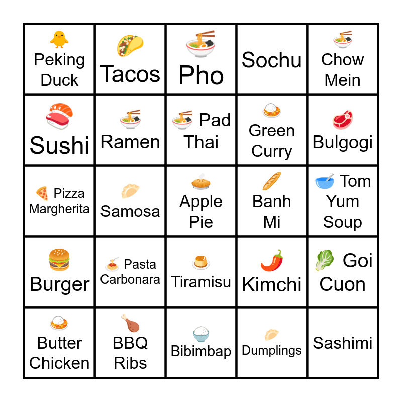 This bingo card has 25 words: 🍔 Burger, 🍗 BBQ Ribs, 🥧 Apple Pie, 🥟 Dumplings, 🍜 Chow Mein, 🐥 Peking Duck, 🌮 Tacos, 🍜 Pho, 🥖 Banh Mi, 🥬 Goi Cuon, 🍣 Sushi, 🍜 Ramen, 🍚 Bibimbap, 🌶 Kimchi, 🥩 Bulgogi, 🍛 Butter Chicken, 🥟 Samosa, 🍜 Pad Thai, 🍛 Green Curry, 🥣 Tom Yum Soup, 🍕 Pizza Margherita, 🍝 Pasta Carbonara, 🍮 Tiramisu, Sochu and Sashimi.