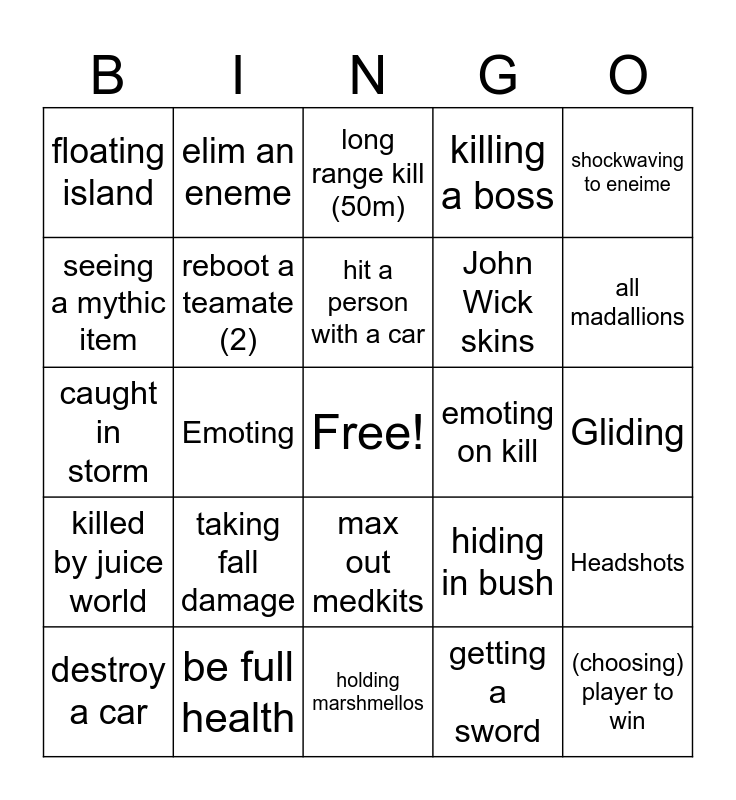 This bingo card has a free space and 24 words: taking fall damage, be full health, hit a person with a car, destroy a car, shockwaving to eneime, floating island, seeing a mythic item, elim an eneme, emoting on kill, max out medkits, John Wick skins, caught in storm, hiding in bush, Headshots, reboot a teamate (2), getting a sword, Gliding, long range kill (50m), all madallions, Emoting, (choosing) player to win, killed by juice world, killing a boss and holding marshmellos.