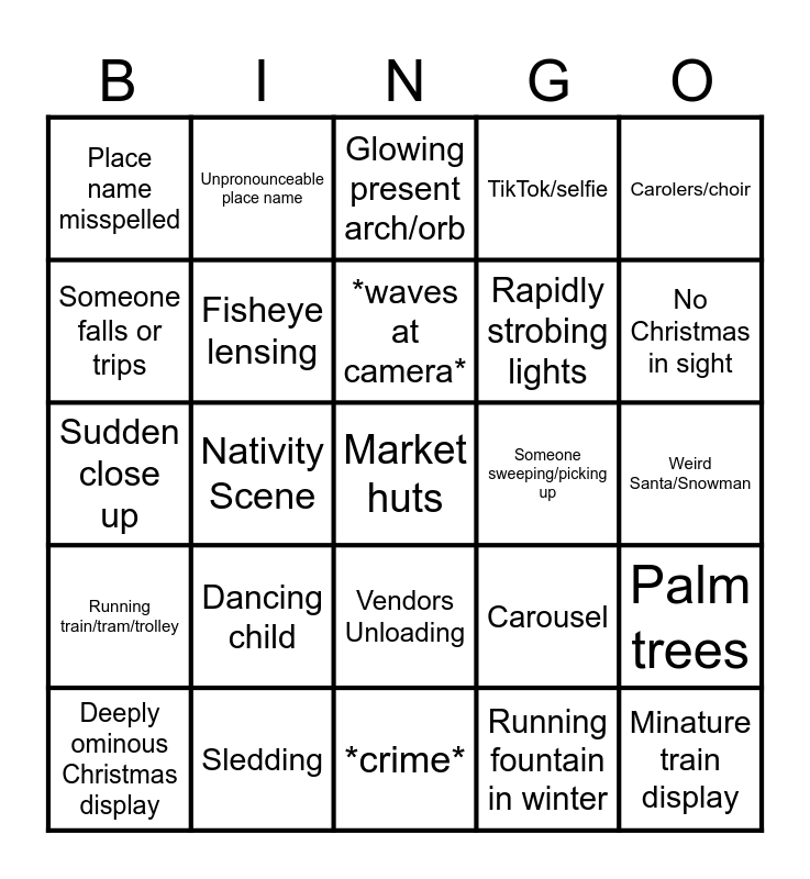 This bingo card has a free space and 35 words: Dog walker, Collapsed display, Glimpse of Russia, Fisheye lensing, Vendors Unloading, TikTok/selfie, Someone falls or trips, Bird Swarm, *waves at camera*, Lone person at night, Sudden close up, Carolers/choir, Fried Camera, Jackson Hole, Place name misspelled, Someone sweeping/picking up, Running fountain in winter, Nativity Scene, Running train/tram/trolley, Minature train display, Carousel, Deeply ominous Christmas display, Palm trees, Sledding, Glowing present arch/orb, No Christmas in sight, Buffering, Camera condensation, Rapidly strobing lights, Weird Santa/Snowman, Massive cathedral, *crime*, Dancing child, Unpronounceable place name and Feliz navidad plays.
