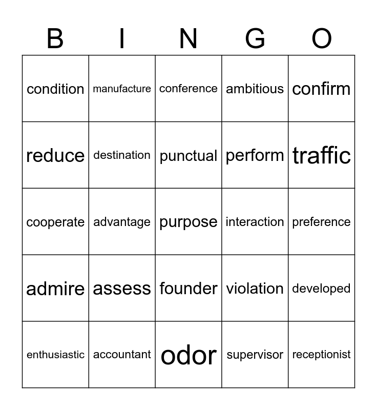 This bingo card has 30 words: accountant, administrator, advantage, chemist, condition, conference, destination, founder, interaction, odor, preference, purpose, supervisor, receptionist, traffic, victim, violation, admire, assess, confirm, cooperate, maintain, manufacture, perform, reduce, ambitious, developed, enthusiastic, punctual and accurately.