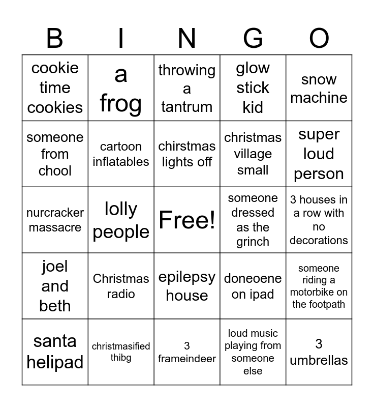 This bingo card has a free space and 24 words: Christmas radio, christmasified thibg, chirstmas lights off, santa helipad, snow machine, cookie time cookies, someone from chool, a frog, someone dressed as the grinch, epilepsy house, christmas village small, nurcracker massacre, doneoene on ipad, someone riding a motorbike on the footpath, cartoon inflatables, loud music playing from someone else, 3 houses in a row with no decorations, throwing a tantrum, super loud person, lolly people, 3 umbrellas, joel and beth, glow stick kid and 3 frameindeer.