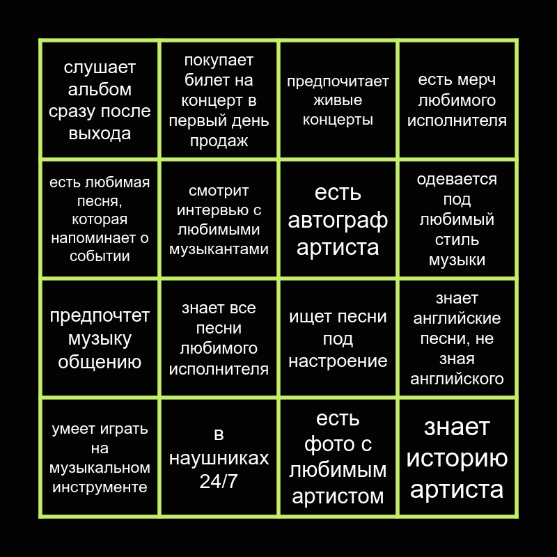This bingo card has 16 words: в наушниках 24/7, знает английские песни, не зная английского, предпочитает живые концерты, слушает альбом сразу после выхода, предпочтет музыку общению, покупает билет на концерт в первый день продаж, ищет песни под настроение, есть фото с любимым артистом, есть любимая песня, которая напоминает о событии, смотрит интервью с любимыми музыкантами, умеет играть на музыкальном инструменте, есть мерч любимого исполнителя, знает все песни любимого исполнителя, одевается под любимый стиль музыки, есть автограф артиста and знает историю артиста.