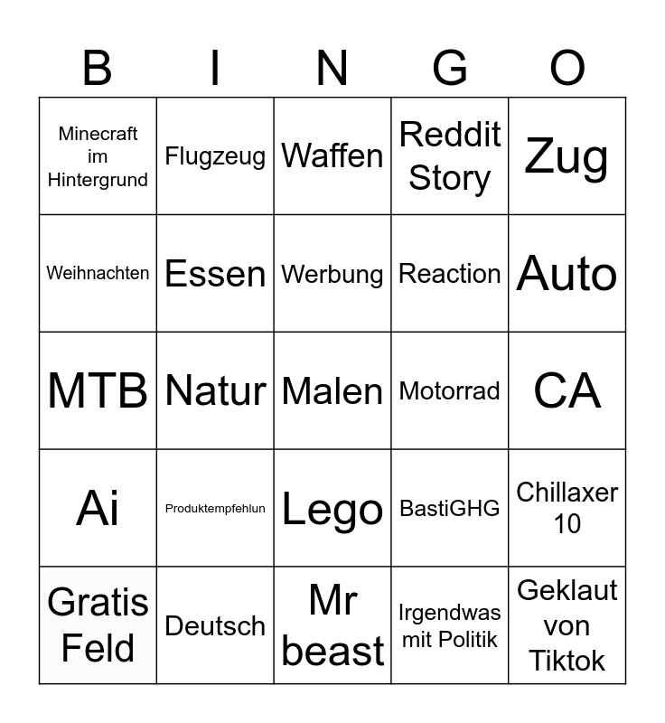 This bingo card has 25 words: Produktempfehlun, Mr beast, Werbung, Gratis Feld, Zug, Minecraft im Hintergrund, Weihnachten, Flugzeug, Motorrad, Lego, Reaction, MTB, BastiGHG, Chillaxer 10, Essen, Geklaut von Tiktok, CA, Waffen, Auto, Natur, Malen, Deutsch, Ai, Reddit Story and Irgendwas mit Politik.