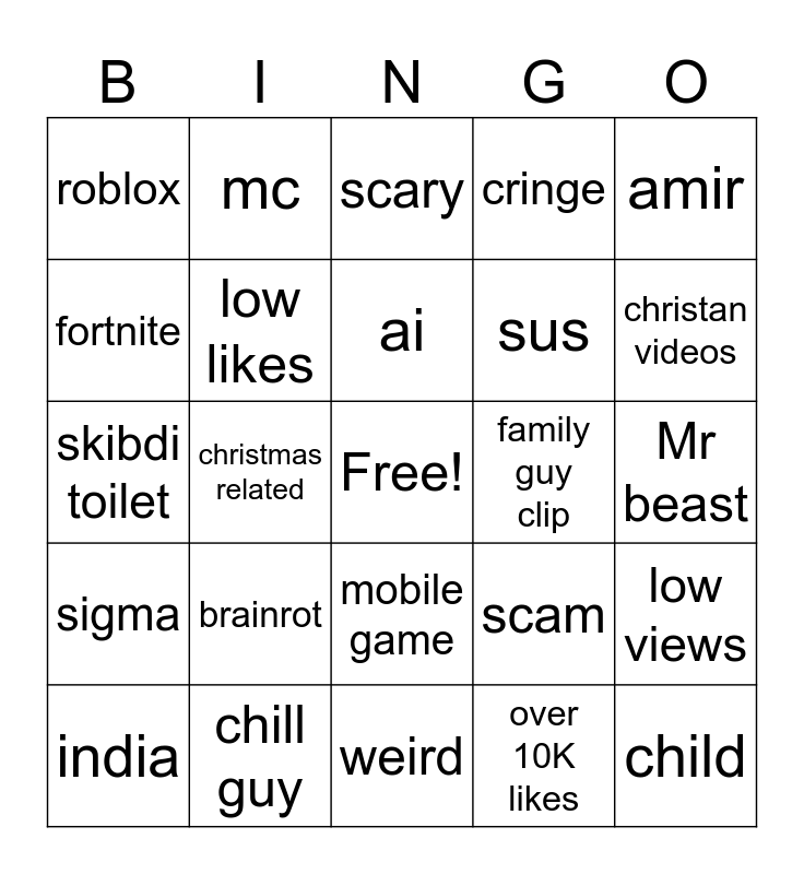 This bingo card has a free space and 24 words: brainrot, chill guy, ai, india, amir, roblox, fortnite, mc, family guy clip, mobile game, sus, skibdi toilet, scam, low views, low likes, over 10K likes, Mr beast, scary, christan videos, christmas related, child, sigma, cringe and weird.