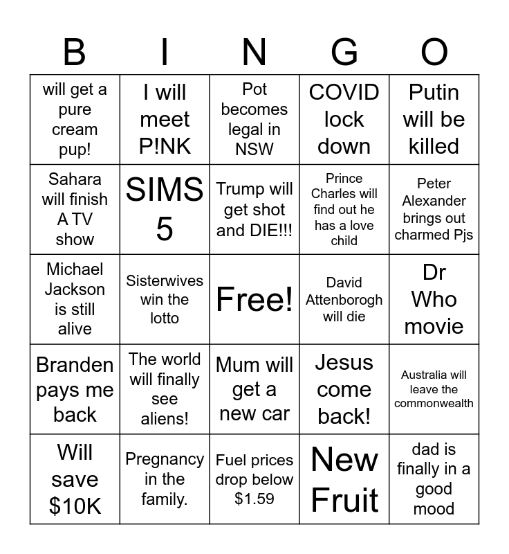This bingo card has a free space and 24 words: The world will finally see aliens!, Pregnancy in the family., Trump will get shot and DIE!!!, Will save $10K, Putin will be killed, will get a pure cream pup!, Sahara will finish A TV show, I will meet P!NK, David Attenborogh will die, Mum will get a new car, Prince Charles will find out he has a love child, Michael Jackson is still alive, Jesus come back!, Australia will leave the commonwealth, SIMS 5, New Fruit, Dr Who movie, Pot becomes legal in NSW, Peter Alexander brings out charmed Pjs, Sisterwives win the lotto, dad is finally in a good mood, Branden pays me back, COVID lock down and Fuel prices drop below $1.59.