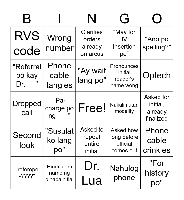 This bingo card has a free space and 24 words: "Susulat ko lang po", Hindi alam name ng pinapainitial, "Ay wait lang po", "ureteropel--????", "Ano po spelling?", RVS code, "Referral po kay Dr. __", Wrong number, Nakalimutan modality, Asked to repeat entire initial, Pronounces initial reader's name wong, Dropped call, Asked how long before official comes out, Phone cable crinkles, Phone cable tangles, Nahulog phone, Asked for initial, already finalized, Clarifies orders already on arcus, Optech, "Pa-charge po ng ___", "For history po", Second look, "May for IV insertion po" and Dr. Lua.
