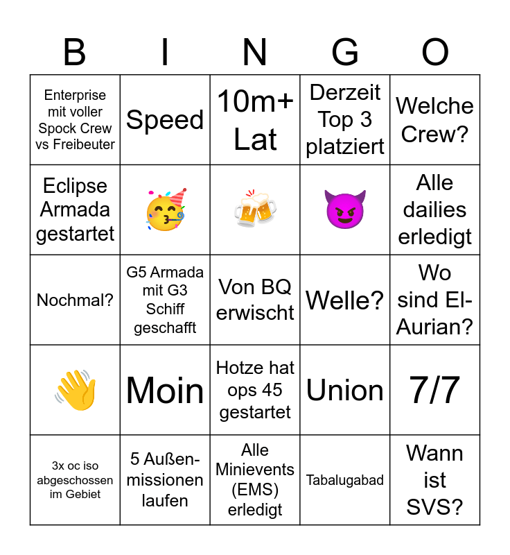 This bingo card has 25 words: Moin, Alle Minievents (EMS) erledigt, π», 3x oc iso abgeschossen im Gebiet, Welche Crew?, Enterprise mit voller Spock Crew vs Freibeuter, Eclipse Armada gestartet, Speed, Welle?, Hotze hat ops 45 gestartet, π, Nochmal?, Union, 7/7, π₯³, Wann ist SVS?, Wo sind El-Aurian?, 10m+ Lat, Alle dailies erledigt, G5 Armada mit G3 Schiff geschafft, Von BQ erwischt, 5 AuΓen- missionen laufen, π, Derzeit Top 3 platziert and Tabalugabad.
