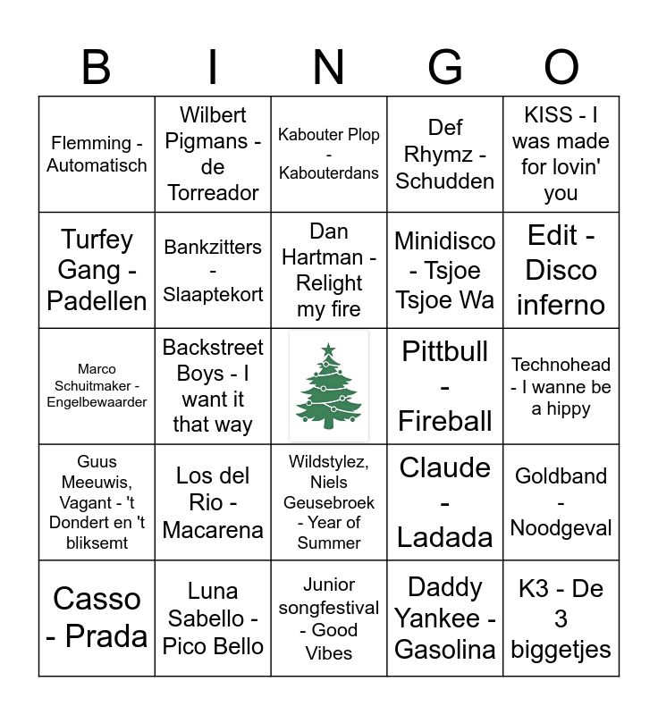 This bingo card has a free space and 41 words: Nick & Simon - Rosanne, Marco Schuitmaker - Engelbewaarder, ABBA - Gimme! Gimme! Gimme!, Bankzitters - Slaaptekort, Luna Sabello - Pico Bello, Wildstylez, Niels Geusebroek - Year of Summer, Dan Hartman - Relight my fire, Opgeblazen, Wilbert Pigmans - De Toreador, KISS - I was made for lovin' you, Guus Meeuwis, Vagant - 't Dondert en 't bliksemt, Backstreet Boys - I want it that way, Def Rhymz - Schudden, K3 - De 3 biggetjes, Technohead - I wanne be a hippy, Pittbull - Fireball, Los del Rio - Macarena, The Cooldown cafe - Hey baby, Flemming - Automatisch, Mart Hoogkamer - ik ga zwemmen, Kabouter Plop - Kabouterdans, Goldband - Noodgeval, Chipz- 1001 Arabian Nights, Junior songfestival - Good Vibes, Minidisco - Tsjoe Tsjoe Wa, Andre Hazes - Ik meen het, La Fuente - I Want You, Daddy Yankee - Gasolina, Elton John - I'm still standing, Edit - Disco inferno, Mariah Carey - All I want for Christmas, Dolly Dots - Love me just al little bit more, Wilbert Pigmans - de Torreador, Casso - Prada, Donnie en Frans Duits- Frans Duits, Claude - Ladada, Turfey Gang - Padellen, Bee Gees - Stayin Alive, Susan en Freek - Goud, DVBBS - Tsunami, Snollebollekes - Sorry voor de overlast and Arjin Oostrom - Zakka Zakka.