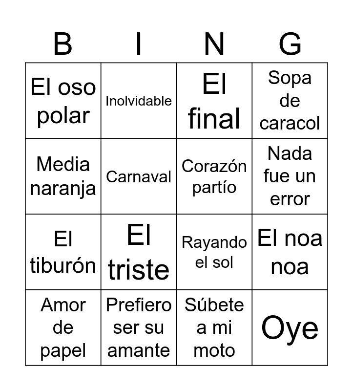 This bingo card has 53 words: Sálvame, Amor de papel, La llorona, Suavemente, Suavecito, La carcacha, Inolvidable, El baile del sapito, Carnaval, El sol no regresa, Corazón partío, Cruz de navajas, Mi primer millón, Talento de televisión, La calle de las sirenas, La gata bajo la lluvia, Nada fue un error, Prefiero ser su amante, Muriendo lento, Media naranja, El noa noa, Arre borriquito, El tiburón, El oso polar, Rata de dos patas, La mujer del pelotero, La niña fresa, Feliz navidad, La bikina, El triste, Dulce niña, Eternamente bella, Color esperanza, Será que no me amas, Noche de copas, Vuela, vuela, Sopa de caracol, La gasolina, El final, Maldita primavera, Levantando las manos, Procura, Súbete a mi moto, 17 años, Tú y yo somos uno mismo, Cuando calienta el sol, Ahora te puedes marchar, La muralla verde, Rayando el sol, Oye, Los luchadores, Nunca es suficiente and Cómo te voy a olvidar.
