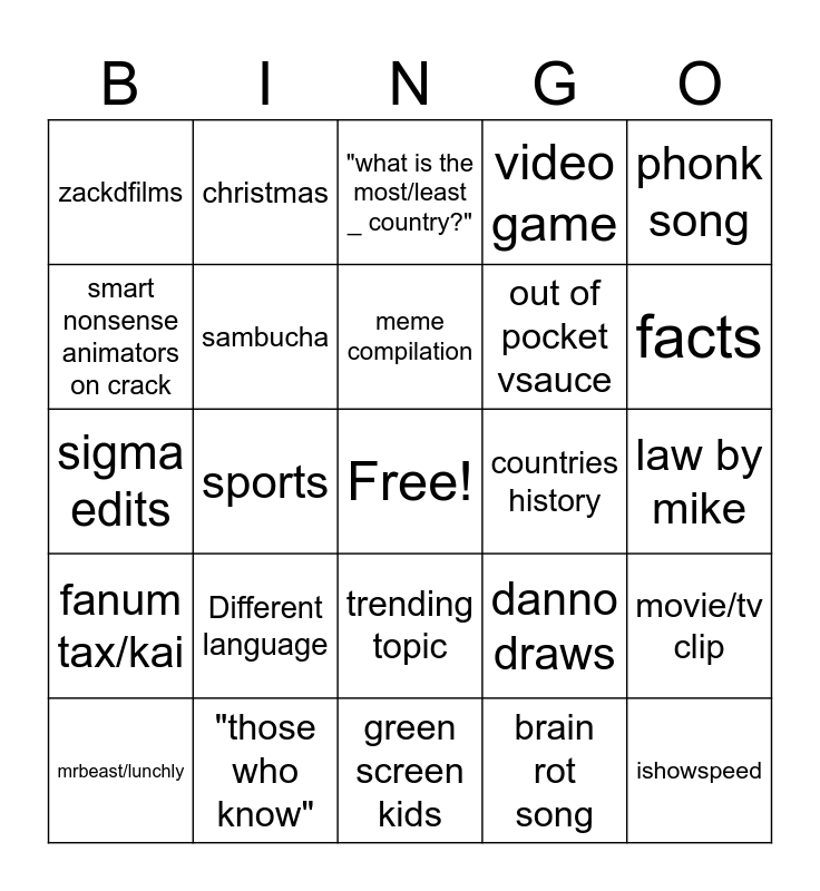 This bingo card has a free space and 24 words: Different language, "those who know", meme compilation, mrbeast/lunchly, phonk song, zackdfilms, smart nonsense animators on crack, christmas, countries history, trending topic, out of pocket vsauce, sigma edits, danno draws, movie/tv clip, sambucha, brain rot song, law by mike, "what is the most/least _ country?", facts, sports, ishowspeed, fanum tax/kai, video game and green screen kids.