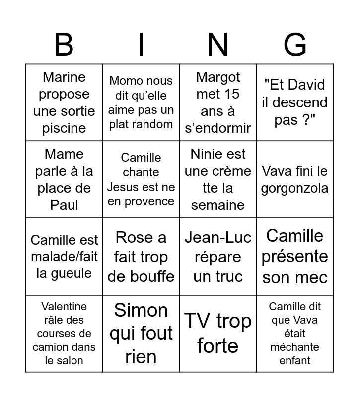This bingo card has 16 words: Simon qui fout rien, Camille présente son mec, Margot met 15 ans à s’endormir, Marine propose une sortie piscine, Camille est malade/fait la gueule, Momo nous dit qu’elle aime pas un plat random, Jean-Luc répare un truc, TV trop forte, Mame parle à la place de Paul, Camille chante Jesus est ne en provence, Valentine râle des courses de camion dans le salon, "Et David il descend pas ?", Rose a fait trop de bouffe, Vava fini le gorgonzola, Ninie est une crème tte la semaine and Camille dit que Vava était méchante enfant.