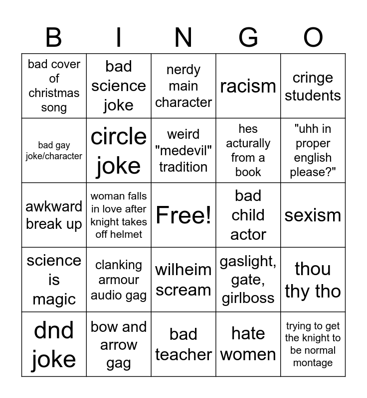 This bingo card has a free space and 28 words: thou thy tho, wrong context history, hes acturally from a book, hate women, bad gay joke/character, nerdy main character, bad science joke, science is magic, bad child actor, dnd joke, awkward break up, racism, bow and arrow gag, bad teacher, "uhh in proper english please?", "oh my papers"/ clumsiness, clanking armour audio gag, circle joke, weird "medevil" tradition, wilheim scream, bad cover of christmas song, night time walk in the snow, trying to get the knight to be normal montage, woman falls in love after knight takes off helmet, sexism, gaslight, gate, girlboss, cringe students and MCU writing.